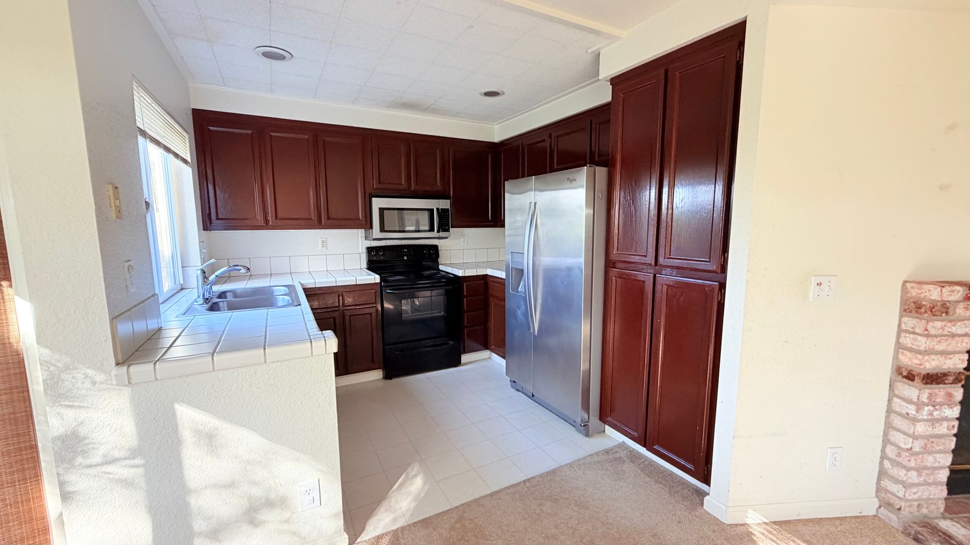 The living area is warm and welcoming, highlighted by a decorative fireplace that enhances the home’s cozy ambiance. Flooring throughout is a tasteful combination of carpet and vinyl, offering both comfort and durability. Step outside to a generously sized backyard, perfect for outdoor dining, relaxation, or entertaining. The home also includes a garage, providing secure parking and additional storage.
