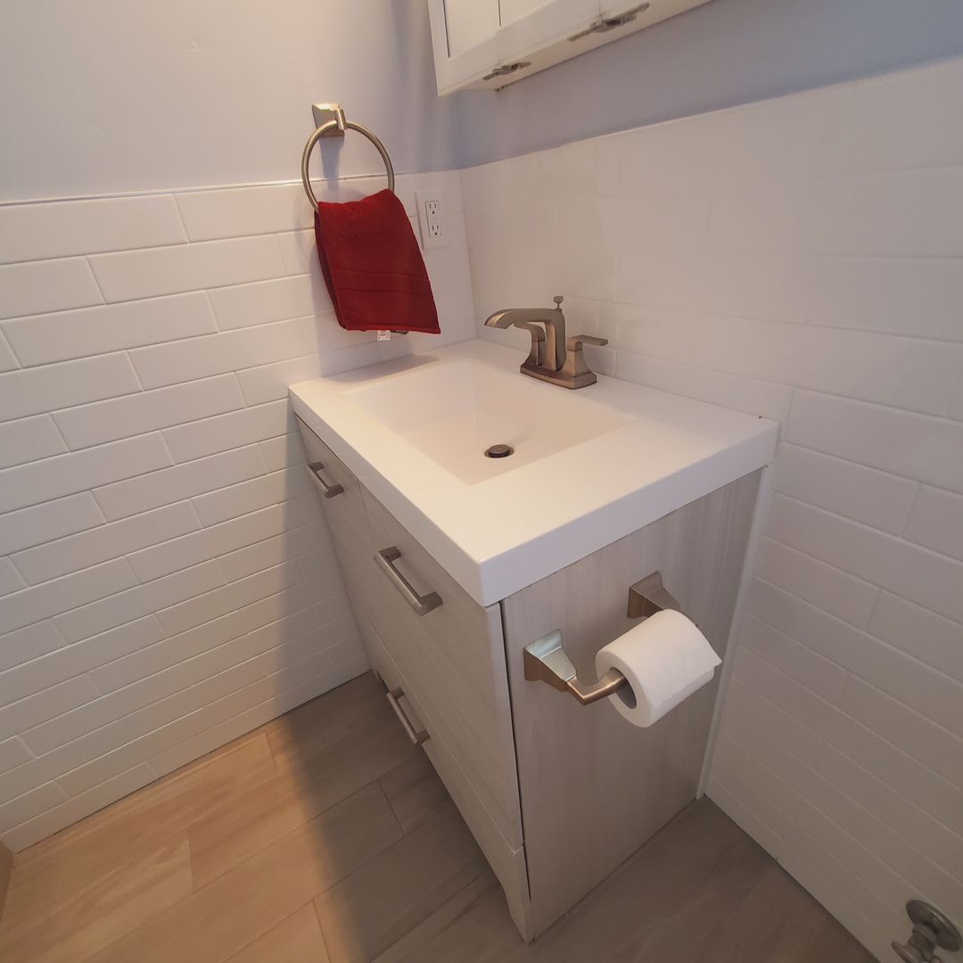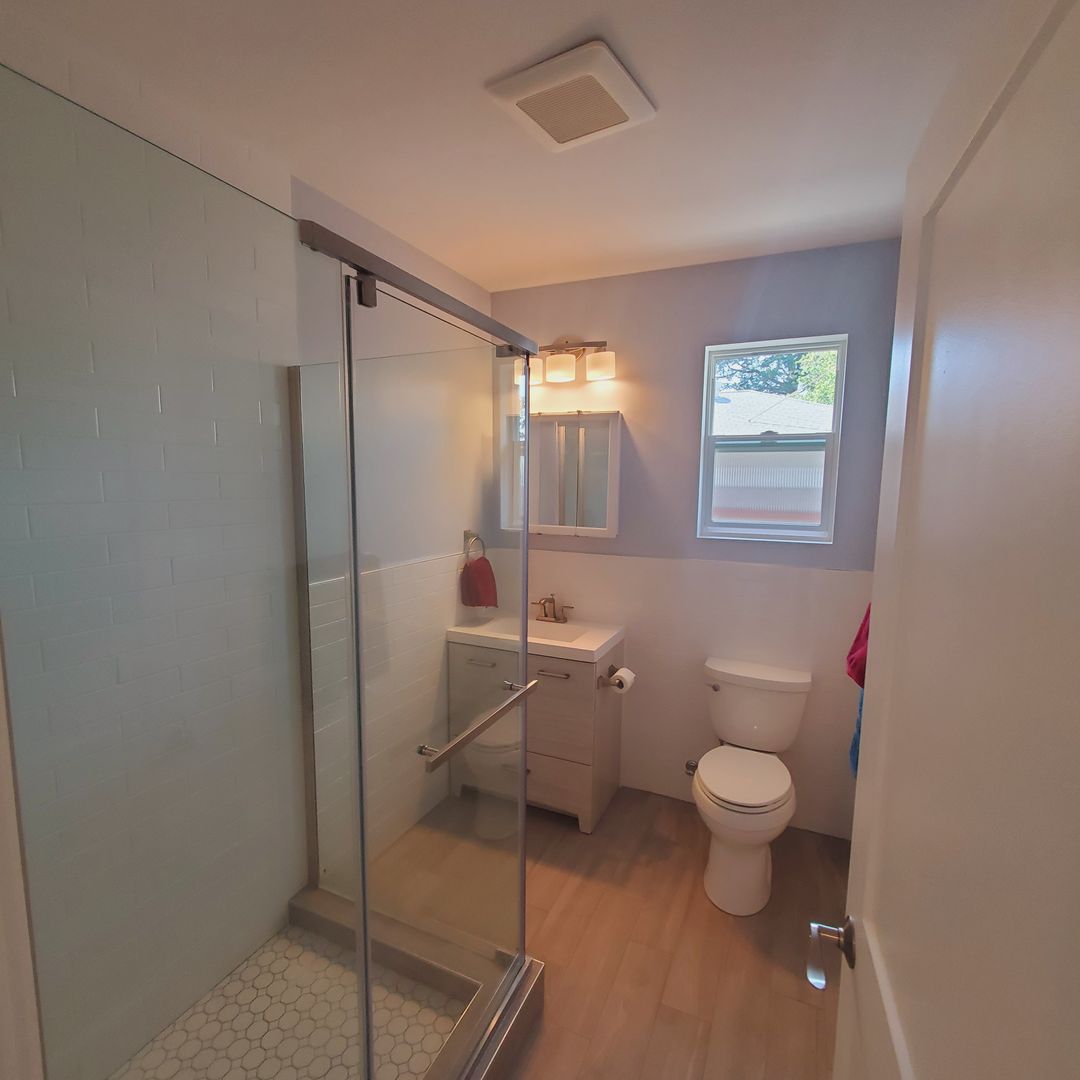 The bath offers a roomy shower stall with gorgeous tile and fixtures. The rest of the bathroom has shite subway tile and upgraded fixtures, excellent lighting, bathroom fan, and a window for natural light.
