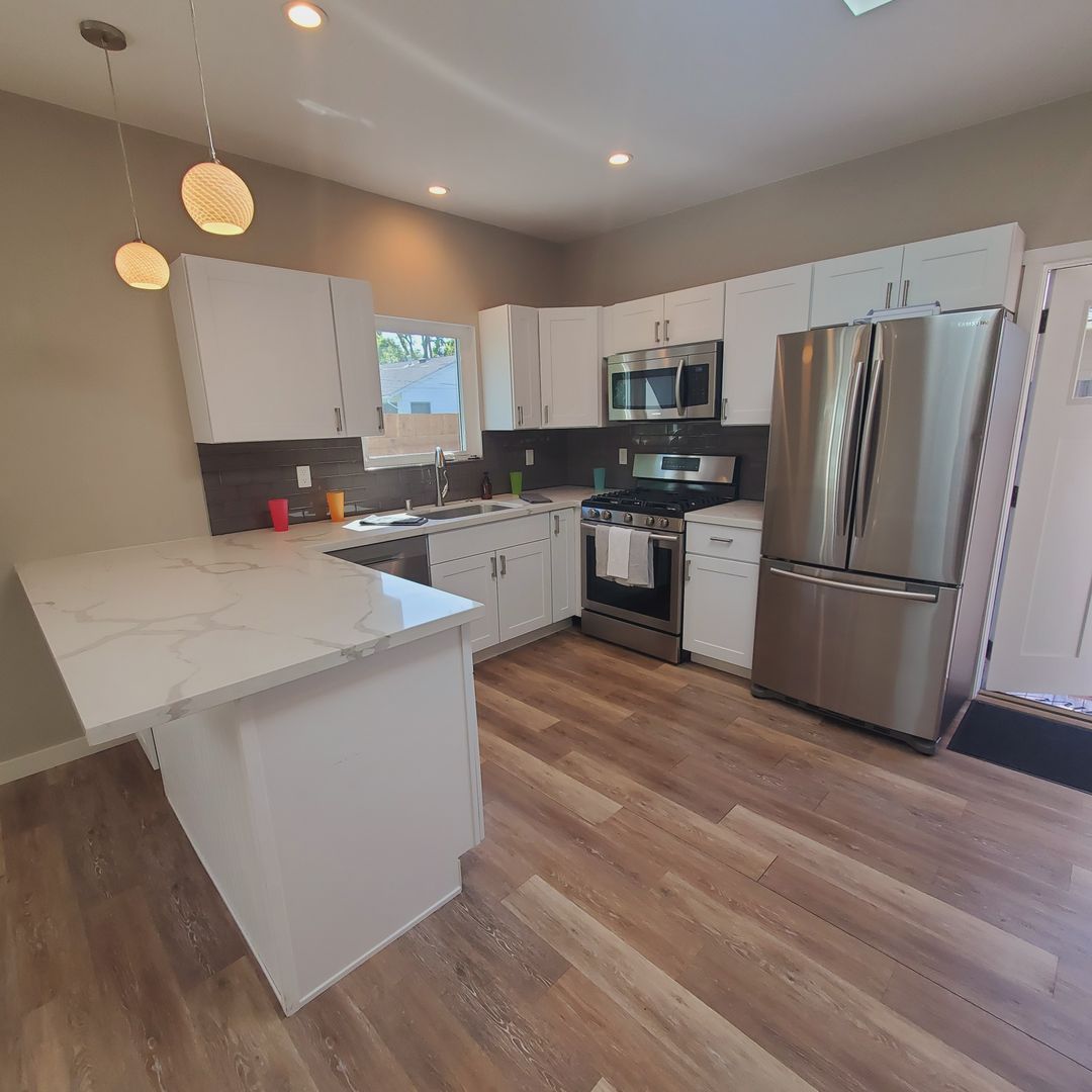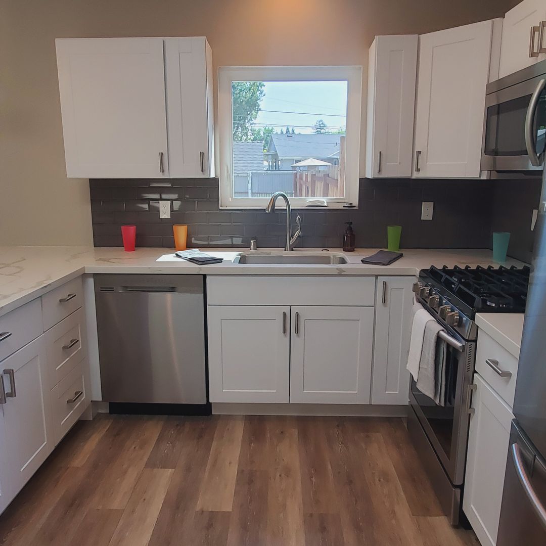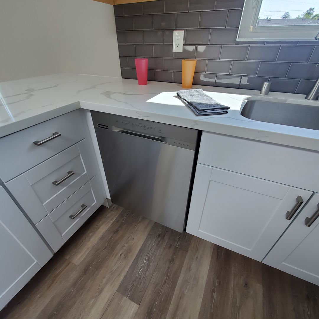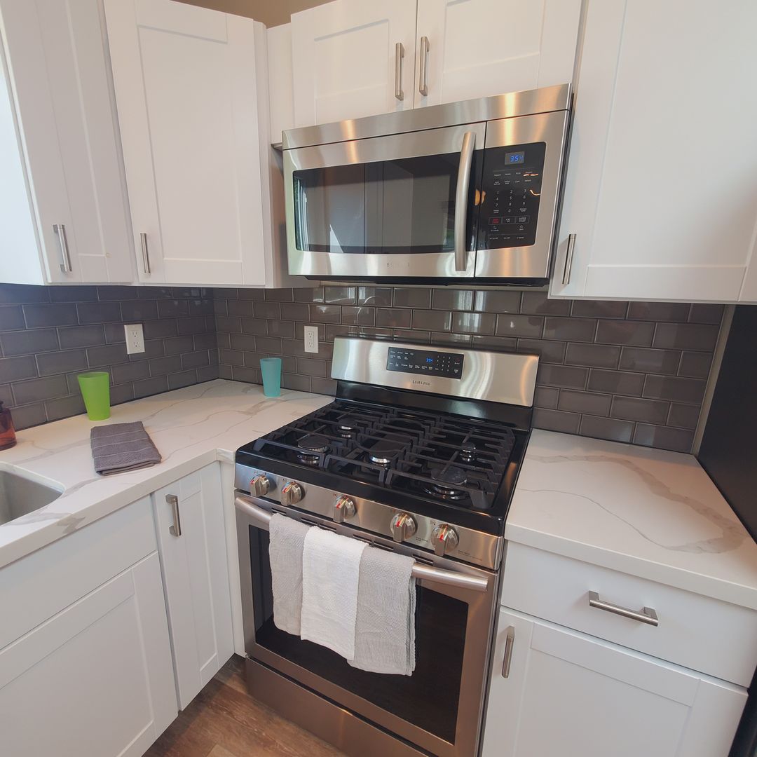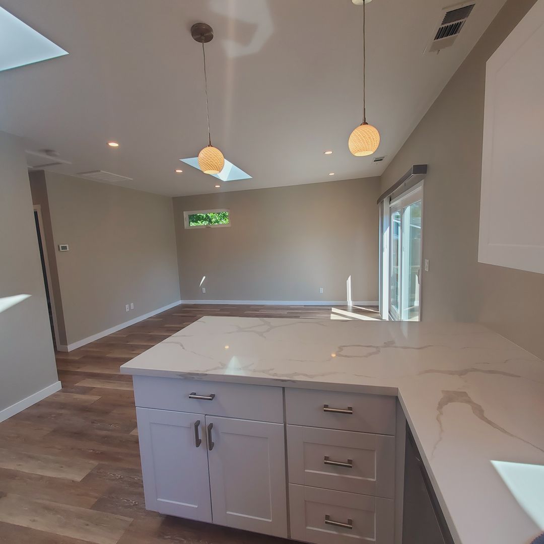 Entering from the front door you are greeted by a beautiful kitchen, updated with white, modern, clean-line cabinetry & counters, gas range, microwave rangehood, dishwasher and full size refrigerator. A skylight brings in extra light. Pendant lights over the center counter make it perfect for a quick breakfast or gathering place while entertaining.