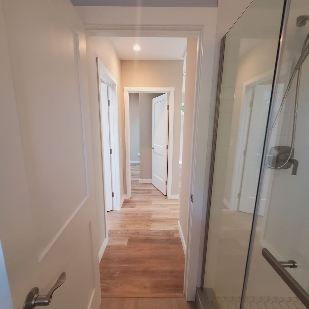 Easy maintenance, richly-colored continuous flooring blends nicely with the neutral paint tones and recessed lights brighten every room.