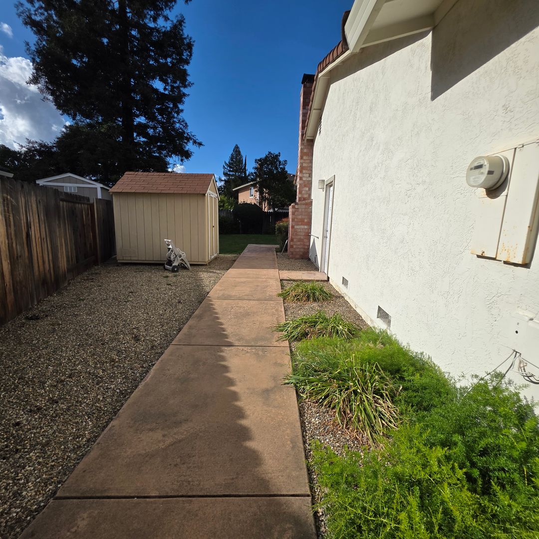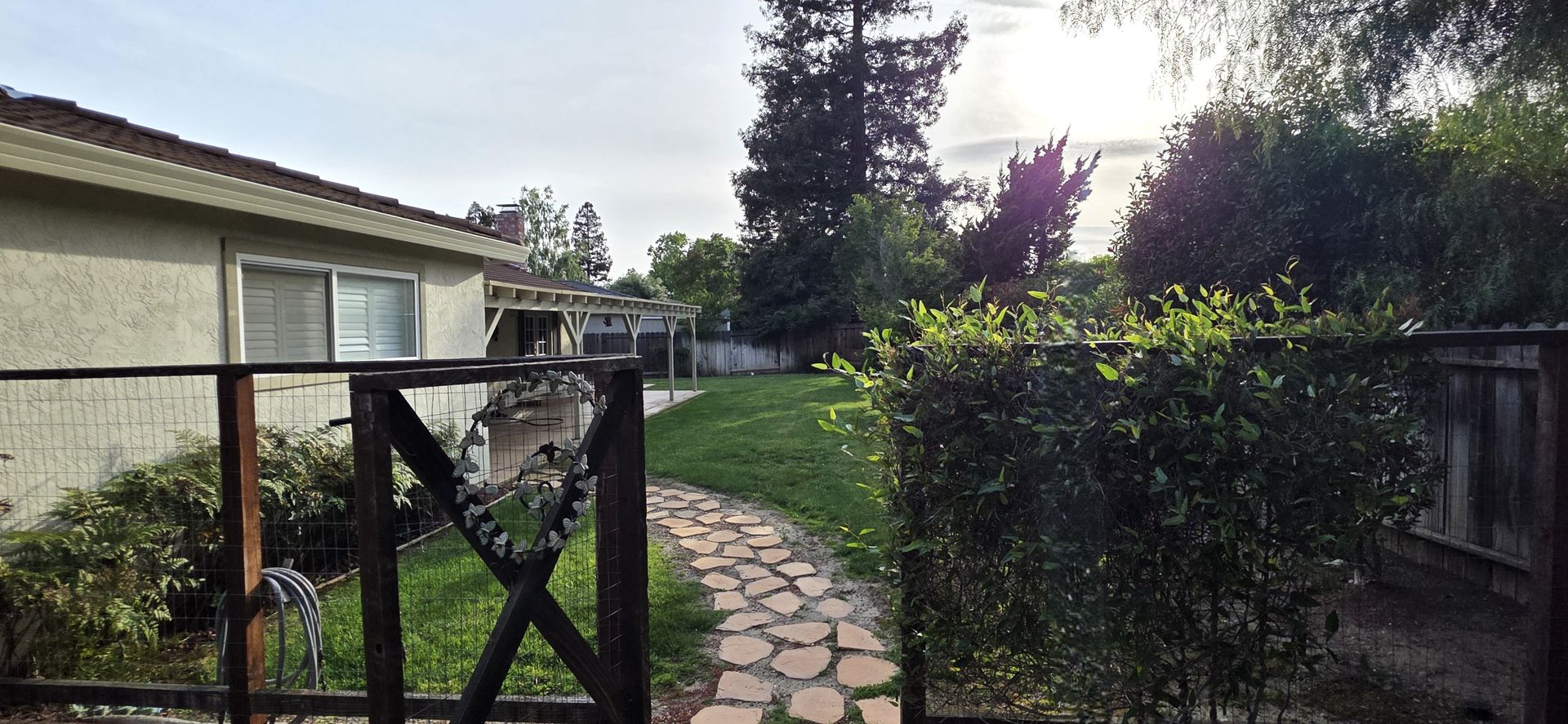 The backyard covered patio can easily fit a myriad of table sets and lounge seating. The landscaping includes plush grass flanked by thriving planter beds. One side yard has a storage shed, and the other side yard is a huge, gated multi-use area with gravel. Garden service is included!